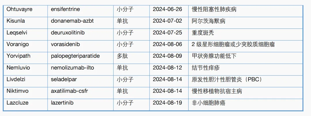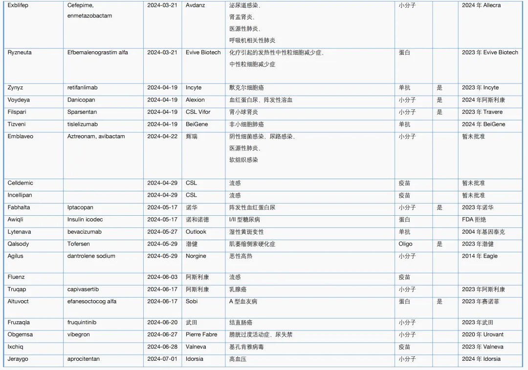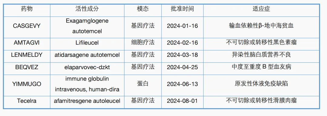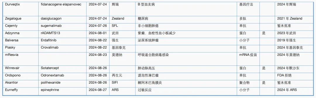 附表2. CBER 2024年一至八月主要新药审批一览表