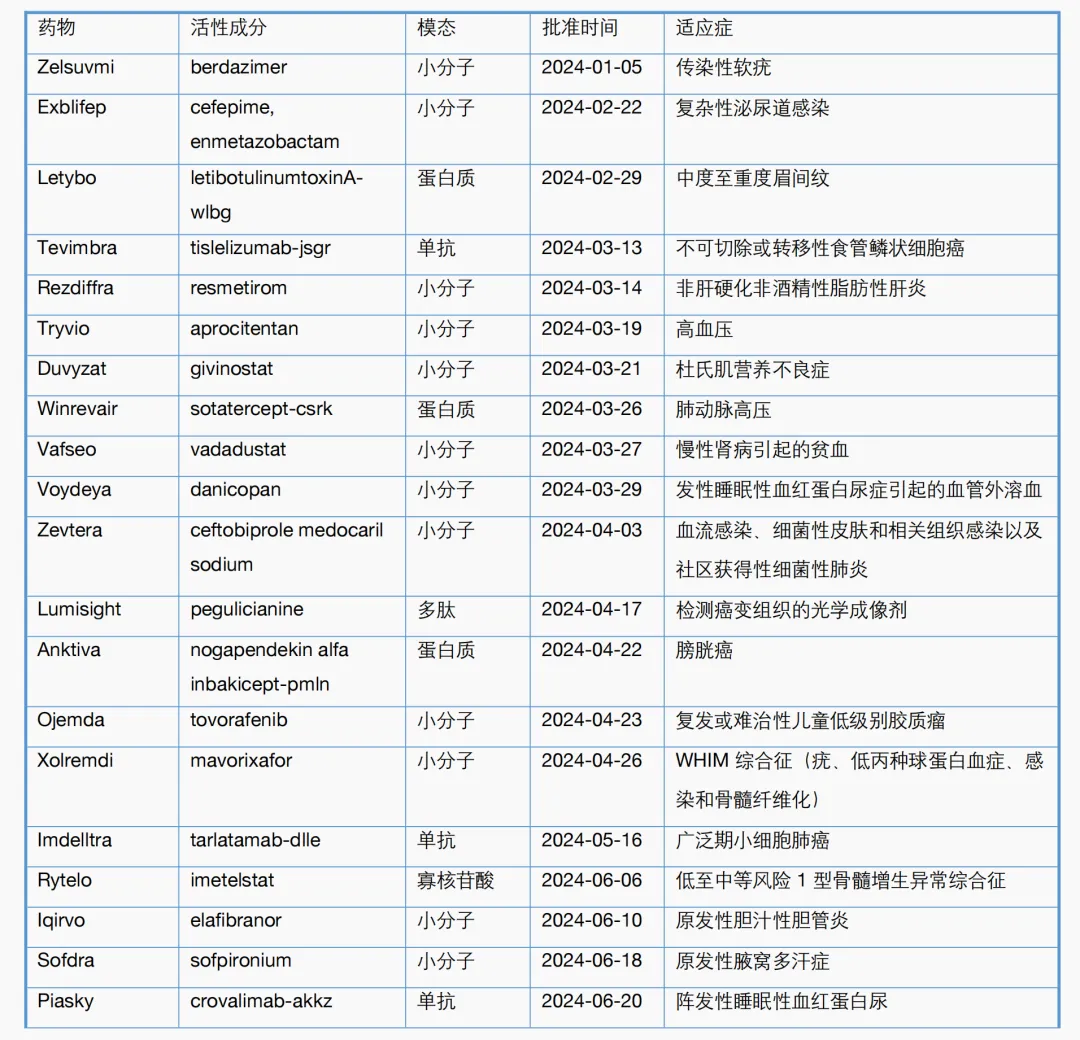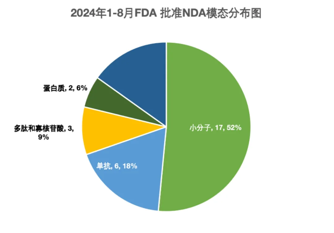 图2. 2024年1至8月FDA批准新药模态分布图。