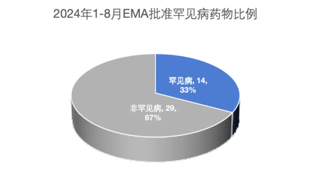 EMA在2024年1至8月批准的药物中有33%针对罕见疾病(图3),这些药物获得了10年的市场独占权,并为中小型生物制药公司提供了额外的激励措施。这表明了监管激励、科学进步和制药行业战略重点在开发罕见疾病治疗中的重要性。