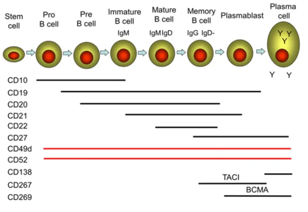 B细胞在骨髓中发育,成熟后进入外周血,其依次明确的表面抗原和DNA重排情况可分为:祖B细胞、前B细胞、未成熟B细胞、过渡B细胞、初始B细胞、记忆细胞、原浆细胞和浆细胞等。其中,B细胞表面抗原包括CD19、CD20、CD38、CD138等,值得注意的是由于CD19在B细胞全生命周期表达、CD20在祖B细胞和浆细胞不表达,这两大靶点成为热门的研究目标。