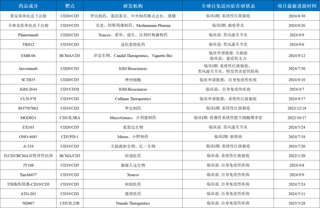 目前,全球范围内有超过20款TCE双抗开展了自免领域适应症探索,靶点选择集中在CD3/CD19、CD3/CD20、CD3/BCMA,大部分处于临床一期及临床前的阶段。