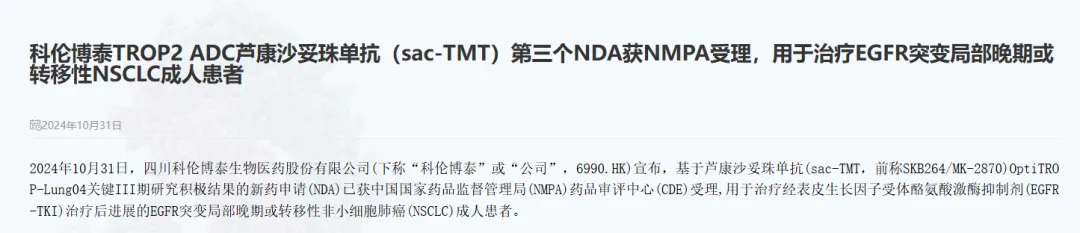 10月31日,CDE官网最新公示,科伦博泰申报的注射用芦康沙妥珠单抗新适应症上市申请获得受理。