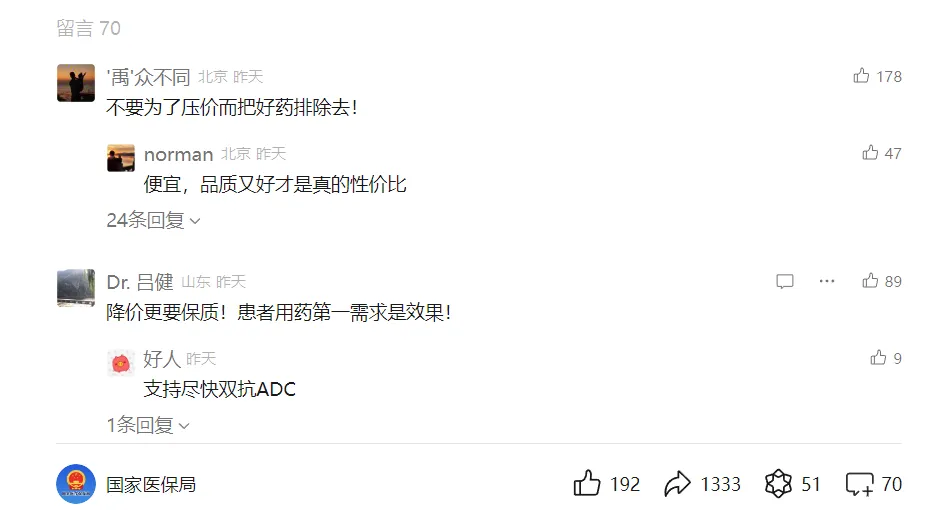 值得关注的是,今年很少看到对灵魂砍价的宣传,在国家医保局官方公众号的评论区,精选留言中许多关于对创新药进医保的呼声。