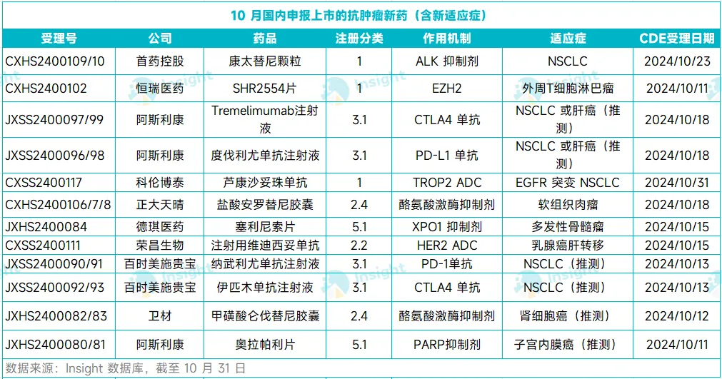 除了上述首次申报上市的新药,10 月还有多款其它新药在中国递交了新适应症上市申请。例如:科伦博泰递交了 TROP2 ADC 芦康沙妥珠单抗的EGFR 突变 NSCLC 上市申请;正大天晴递交了安罗替尼的软组织肉瘤一线治疗的上市申请;荣昌生物递交了 HER2 ADC 维迪西妥单抗的肝转移晚期乳腺癌的申请等等,限于篇幅,本文不再一一介绍。