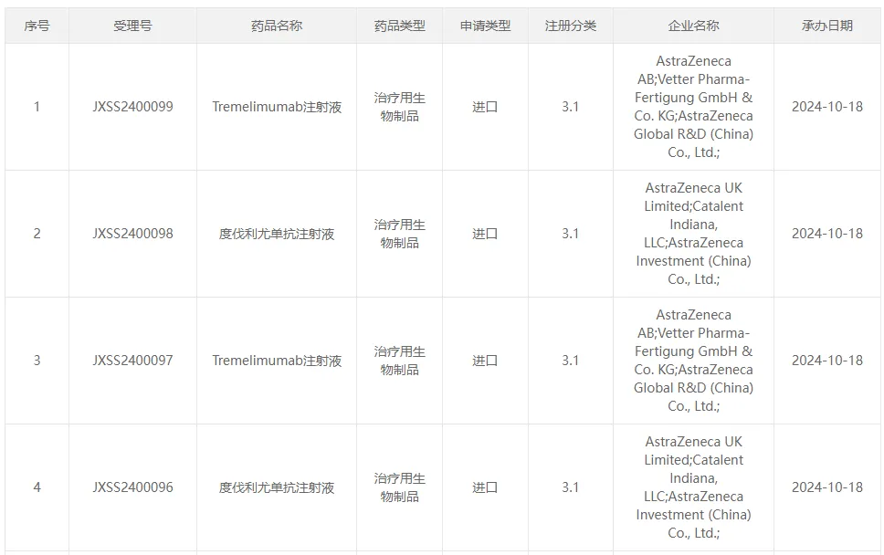 10 月 18 日,CDE 受理了阿斯利康度伐利尤单抗和替西木单抗(Tremelimumab)的上市申请。根据该药物此前国外获批适应症和临床研究推测,本次国内报上市可能是:两药联合用于非小细胞肺癌一线治疗或者是肝细胞癌一线疗法。本次是替西木单抗首次在国内报上市,它也是国内第二个报上市的 CTLA4 单抗。