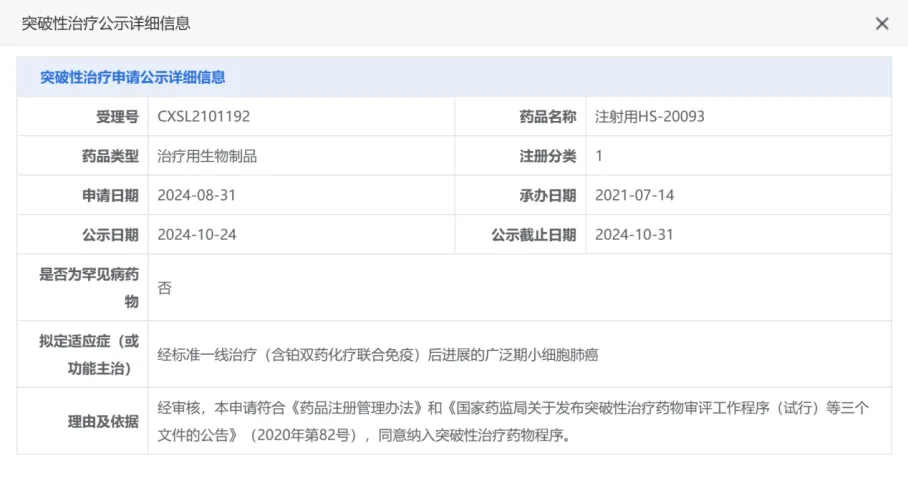值得关注的是,突破性疗法旨在加速开发及审查治疗严重的或威胁生命的疾病的新药。在本次拟纳入CDE“突破性治疗品种”之前,HS-20093也在美国FDA获得了“突破性疗法”(BTD)。