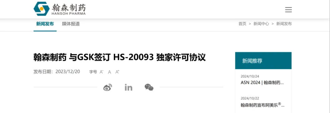 此前,HS-20093成功“出海”已经引发了行业热点关注。2023年12月,翰森制药与葛兰素史克(GSK)订立了一项超17亿美元的独家许可协议,GSK获得开发、生产及商业化HS-20093的全球独占许可(不含大中华区)。今年8月,GSK宣布HS-20093获FDA突破性疗法认定,用于治疗含铂化疗期间或之后进展的复发或难治性ES-SCLC患者。本次FDA突破性疗法的认定得到了Ⅰ期ARTEMIS-001首次人体临床试验的数据支持。