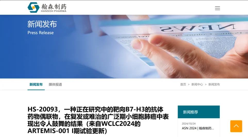 根据翰森制药公布的相关信息,HS-20093是一种新型B7-H3靶向ADC,由全人源化的B7-H3单抗与拓扑异构酶抑制剂(TOPOi)有效载荷共价连接而成。公开资料显示,HS-20093有十多项临床研究正在开展,包括针对复发性小细胞肺癌和局限期小细胞肺癌的两项Ⅲ期临床研究,以及多项用于治疗肺癌、肉瘤、头颈癌及其他实体瘤的Ⅰ期和Ⅱ期临床研究。
