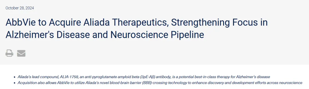 “神经科学是我们的关键增长领域之一,我们致力于推动这一领域的创新,以满足阿尔茨海默病等严重衰弱性神经疾病患者尚未得到满足的关键需求。”艾伯维研发执行副总裁兼首席科学官 Roopal Thakkar 博士表示:“这次收购使我们立即能够推进 ALIA-1758 的发展,这是一种可能成为阿尔茨海默病最佳疾病修饰疗法的新药。此外,Aliada 的新型 BBB 穿透技术也增强了我们的研发能力,使我们能够加快开发治疗神经系统疾病和其他疾病的下一代疗法,在这些疾病中,加强向中枢神经系统输送治疗药物是有益的。”