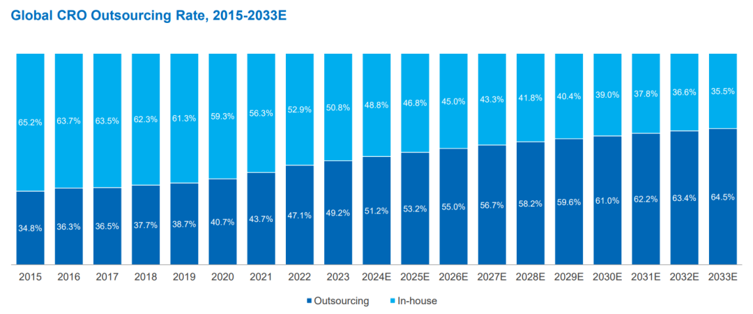 MNC和Biotech都越来越离不开外包。据Frost & Sullivan统计预测,2024年是一个关键的分水岭,生物医药行业整体外包率首次超过50%,并将持续上涨。这意味着在未来,专业化的分工趋势将越来越流行。