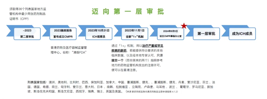最新的《施政报告》也提及,将加快新药在香港审批上市,并借由香港的临床数据和审批结果促进新药内地和国外开展临床并获批,这将有赖于药品器械独立审评机构CMPR。目前,CMPR筹备办公室已成立。CMPR旨在打破香港以往两层审批模式(见下图),并在未来发展成为独立审评机构。