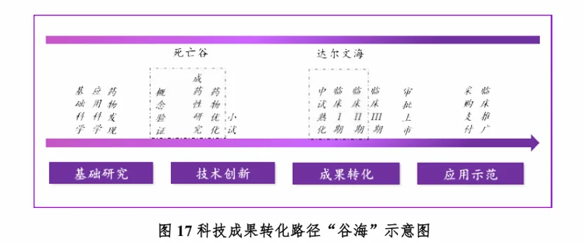 《蓝皮书》以新药研发流程为线索,将生物科技成果转化路径划分为基础研究、技术创新、成果转化、应用示范四个阶段,并将全球新药研发实践与中国生物医药创新现状相结合,梳理出生物科技转化路径中的两大“卡点”:“死亡谷”与“达尔文海”。