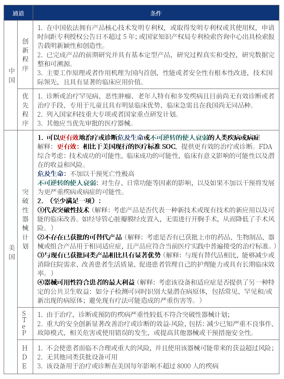 美国特别审评通道包括以明显临床诊疗优势为主的突破性器械计划、以临床安全性突破为主的STeP计划和面向罕见患者群体的人道主义设备豁免计划(HDE),并未突出创新概念。对比美国与我国特别审评通道设置的具体条件,总结差异,为我国特别审评通道的完善提供思考借鉴,具体见表1。
