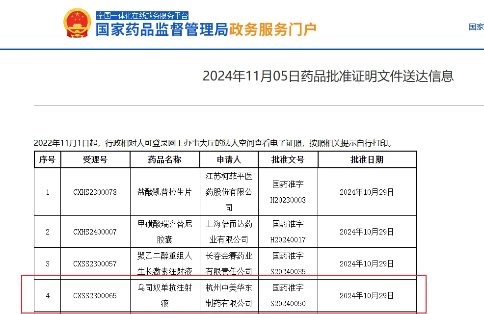 11月5日,国家药监局网站显示,华东医药的乌司奴单抗生物类似药HDM3001获批上市。该品种是首款上市的国产乌司奴单抗生物类似药。