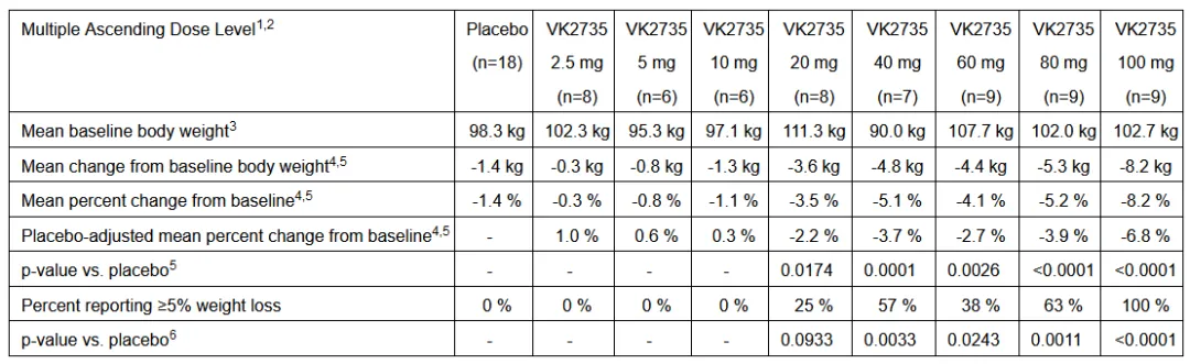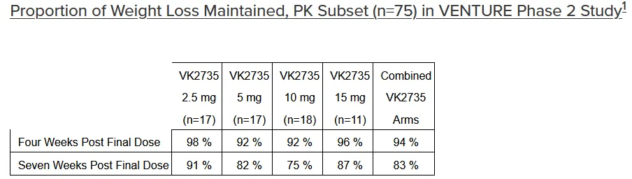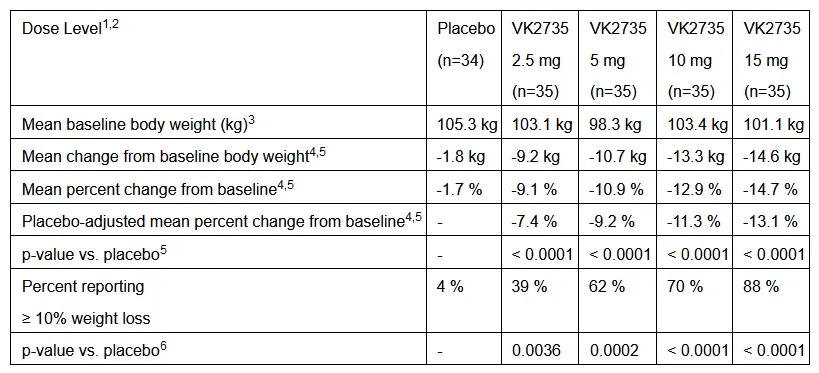 对药代动力学(PK)指标进行评估的结果表明,接受VK2735治疗的患者在接受研究中的最后一次VK2735四周后,其体重减轻的大部分效果均得以维持(所有队列患者的体重与基线和安慰剂组相比皆p<0.0001)。此结果包括接受每周2.5毫克最低剂量的队列,该队列在接受最后一次给药四周后,98%患者的初始体重减轻效果得以保持。此外,最后一次给药七周后的随访评估显示,患者体重减轻效果持续维持,在合并的PK亚群患者中维持了超过80%的原始体重减轻效果(所有队列患者体重与基线和安慰剂组相比,p<0.0005)。该公司认为,这些结果支持在维持治疗中每月一次给药的可行性。