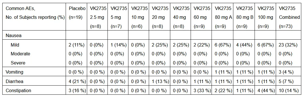 安全性方面,在28天试验期间,剂量高达100毫克(含100毫克)的每日口服VK2735显示出令人鼓舞的安全性和耐受性。迄今为止报告的大多数(99%)治疗伴发不良事件(TEAE)为轻度或中度,其中大多数(90%)为轻度。同样,所有观察到的胃肠道(GI)不良事件为轻度或中度,其中大多数(84%)为轻度。