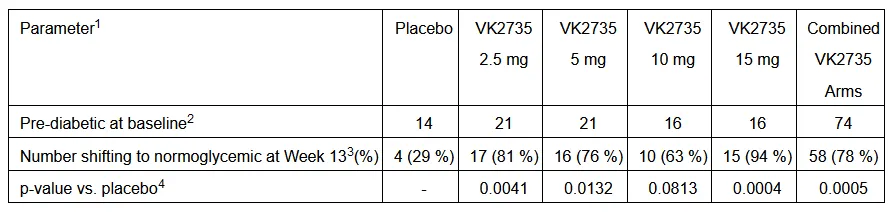 该试验还对受试者糖尿病状态的变化进行了探索性分析。结果显示,VK2735治疗显著增加了基线为糖尿病前期状态的患者在13周治疗期间转为正常血糖状态的可能性。此外,基线时血糖状态正常的患者转变为糖尿病前期状态的比例也有利于VK2735,约有31%的安慰剂患者转变为糖尿病前期状态,而接受VK2735治疗的患者中这一比例仅为2%。