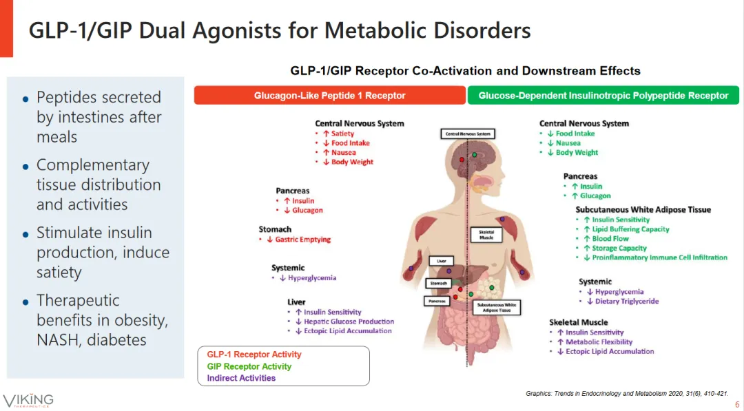 ▲同时靶向GLP-1/GIP受体在治疗代谢疾病上具有互补的组织分布与活性(图片来源:参考资料[3])
