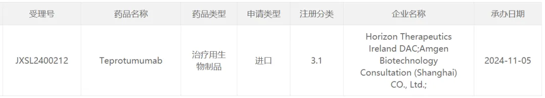今日(11月5日),中国国家药监局药品审评中心(CDE)官网最新公示,由Horizon Therapeutics和安进(Amgen)共同申报的teprotumumab的新药临床试验申请(IND)获得受理。公开资料显示,这是一款“first-in-class”靶向IGF-1R的单抗,也是首款获得美国FDA批准治疗甲状腺眼病的创新疗法。2023年10月,安进以总价值278亿美元完成对Horizon公司的收购,从而获得这款产品。该产品还于2023年入选了被誉为“医药界的诺贝尔奖”的盖伦奖(Prix Galien USA Awards)最佳罕见病产品奖(候选产品)。