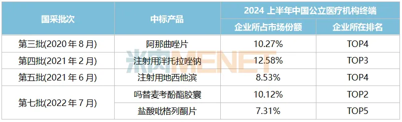 随着各批次国采陆续落地执行,助力中美华东的中标产品提升市场占有率,2024上半年在中国城市公立医院、县级公立医院、城市社区中心及乡镇卫生院(简称中国公立医疗机构)终端,中美华东已成为了吗替麦考酚酯胶囊的TOP2企业(国内龙头)、注射用泮托拉唑钠的TOP3企业。