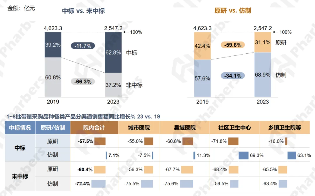 根据法伯院内渠道数据显示,从产品类型表现来看,截止2023年底已执行的1-8批集采品种中,整体中标和未中标产品、原研和仿制产品的总体销售额都是下降的,各类产品因降幅不同而导致了产品格局的变化。与未中标产品相比,中标产品整体降幅较小(-11.7%),占比明显增加;原研产品整体降幅大于仿制产品,相较于2019年,2023年仿制产品的市场份额进一步提高(图1)。