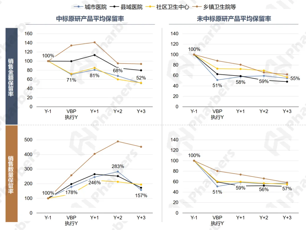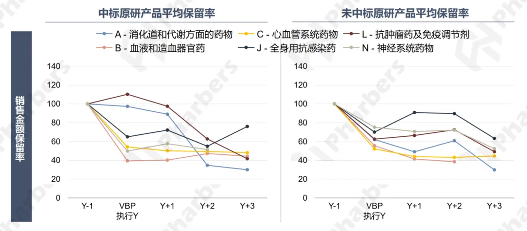 *本报告原研产品保留率以每个产品执行前一年的销量和销售额作为基准100%,后续各个年份均与“Y-1”年做比较,得到每个产品后续各个年份的保留率,再在各维度上汇总原研产品平均保留率。