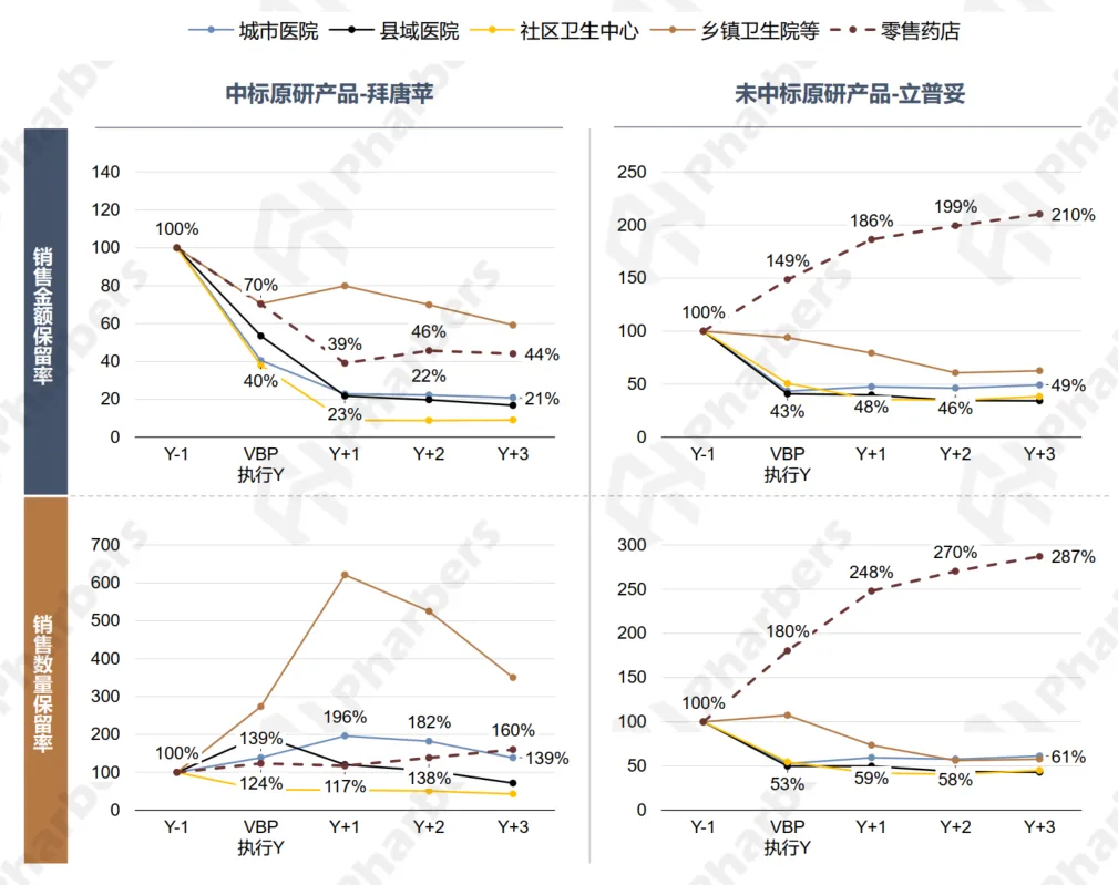 中标原研产品以拜唐苹为例,在院内渠道的销量保留率均较高,在城市医院能达到150%左右,但是销售额的保留率仅为20%-40%,低于立普妥在城市医院渠道的保留率。在院外零售药店渠道虽然销售量也能达到100%以上,但是销售额保留率仅保持在50%以下(图4)。