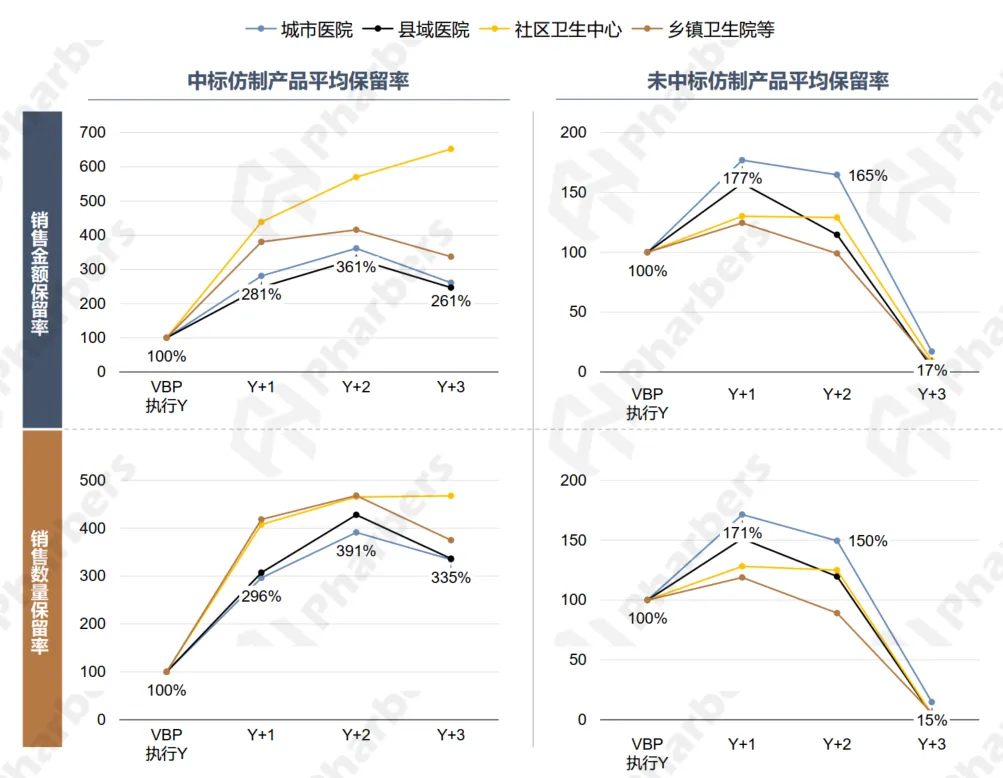 根据法伯院内渠道数据统计结果显示,未中标原研产品在院内渠道市场依然有50%以上的产品销量及销售额保留(各产品平均),尤其是在原本销量并不高的广阔市场渠道,平均保留率维持在60%左右。此外,因未中标原研产品价格变化不大,所以销售数量和金额的保留率较为一致。对于原研中标产品,经过以价换量,销售额的保留率高于原研未中标产品,尤其在广阔市场,县域医院和乡镇卫生院在带量采购执行两年内销售额保留率都高于100%(图2)。