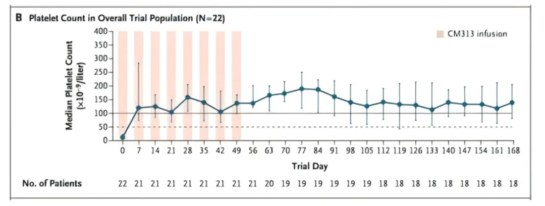 这一研究结果发表在了医学顶级期刊《新英格兰医学杂志(NEJM)》上,该研究共入组22例患者,除1例患者首次给药后脱落,其余21例患者均完成了8次给药和16周的随访。21例患者在整个研究期间达到总体缓解(完全或部分缓解),其中20例患者达到完全缓解。大多数患者因CM313治疗后血小板计数恢复正常或安全水平而停用伴随治疗药物。