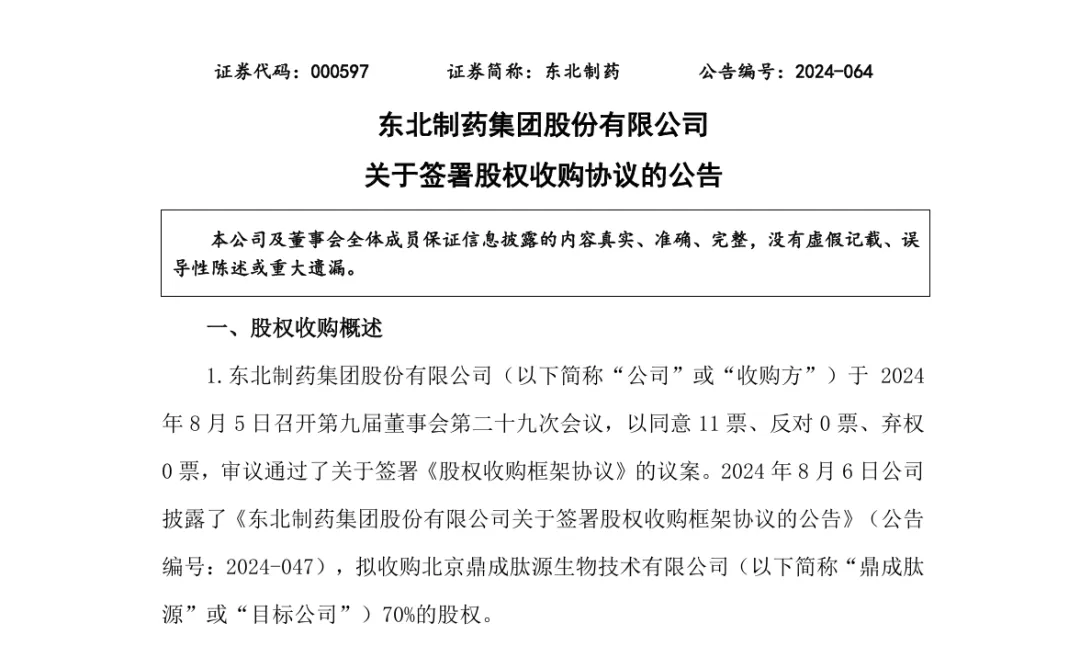 2024年11月6日,东北制药公告,称公司已于2024 年11 月5日召开第九届董事会第三十三次会议,以同意11票、反对0票、弃权0票,审议通过了《关于签署<股权收购协议>的议案》。而随着审议通过,东北制药将以自有资金形式现金购买转让方持有的鼎成肽源 70%的股权。据悉,此次股权收购价款为人民币186,755,022.22 元。
