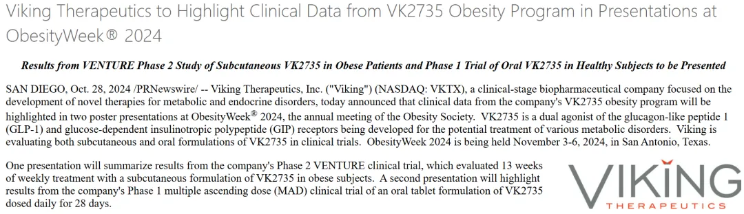11月3日,Viking Therapeutics在2024年美国肥胖周(ObesityWeek 2024)公布了其胰高血糖素样肽-1受体/葡萄糖依赖性促胰岛素多肽受体(GLP-1R/GIPR)双重激动剂VK2735皮下注射剂型的II期VENTURE研究结果,以及该药口服剂型在健康受试者中的I期研究结果。