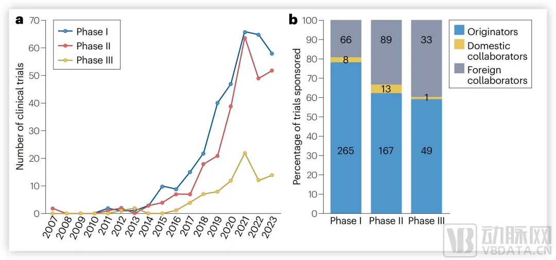 中国创新药在美开展临床试验数量及赞助者分类,图源《Nature》