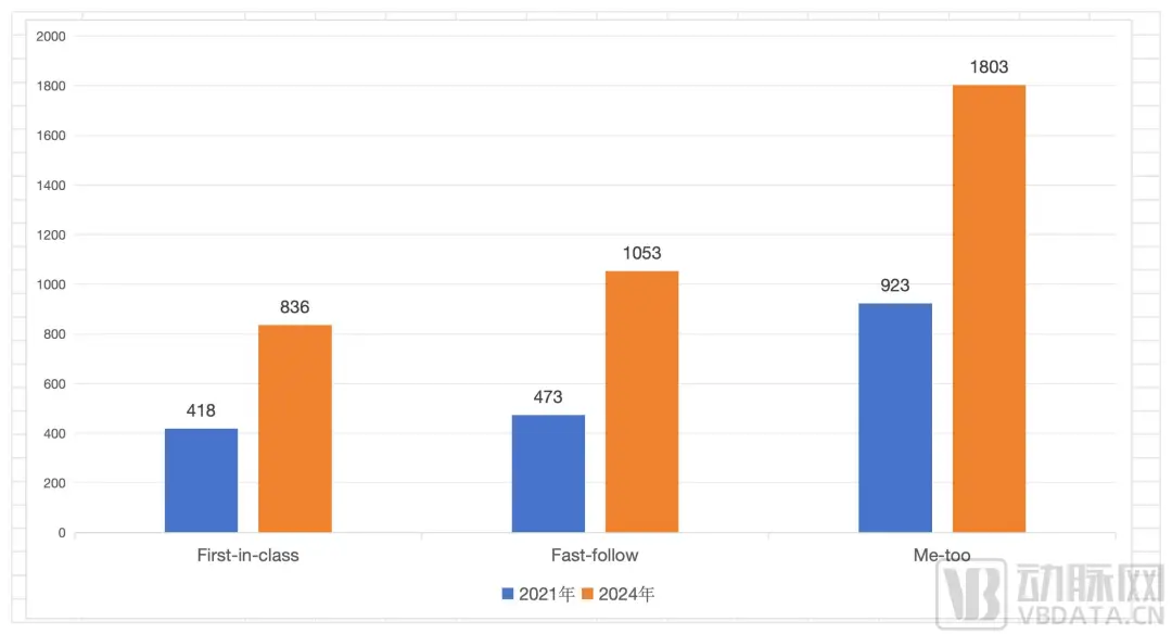 而《Nature Reviews Drug Discovery》发布的数据也显示,中国在研药物中“First-in-class”产品从2021年的418个增至2024年的836个,增长达100%;“Fast-follow”产品从2021年的473个增至2024年的1053个,增长约123%,均高于“Me-too”在研产品95%的增长率。