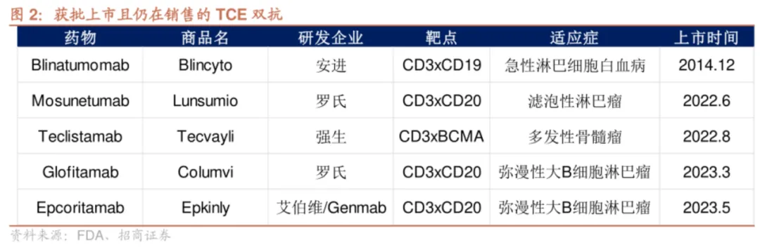 第一款TCE疗法的双抗Catumaxomab,一条早产儿的管线,商业化做得非常不成功,暂且不论。真正意义上把TCE推向舞台中央的,是安进的blinatumomab,上市于2014年,用于治疗血液性疾病,清除过多的B细胞。