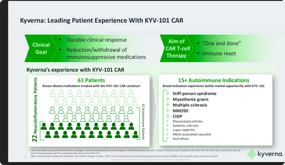 KYV-101迄今为止已经治疗了61名患者,其中有41名自免患者,22名是其中的中枢神经病学患者,在其10月份发布的投资者关系PPT中,给出的目前是对自免疾病的一次性治疗和免疫系统的重建。