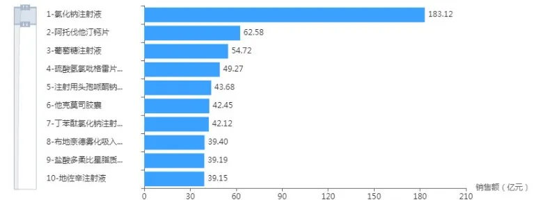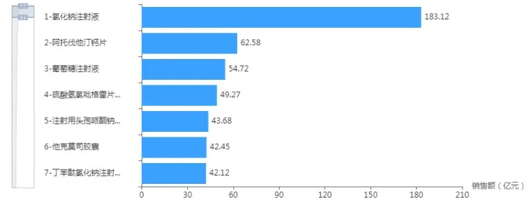 TOP3品种来看,氯化钠注射液、阿托伐他汀钙片、葡萄糖注射液占据前三。