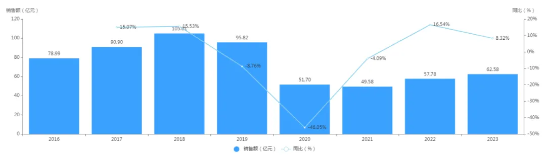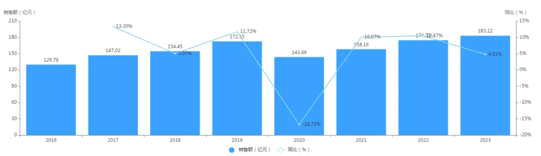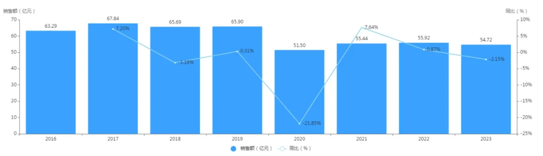图7 2016年—2023年,葡萄糖注射液国内公立医疗机构销售额 图片来源:药智数据