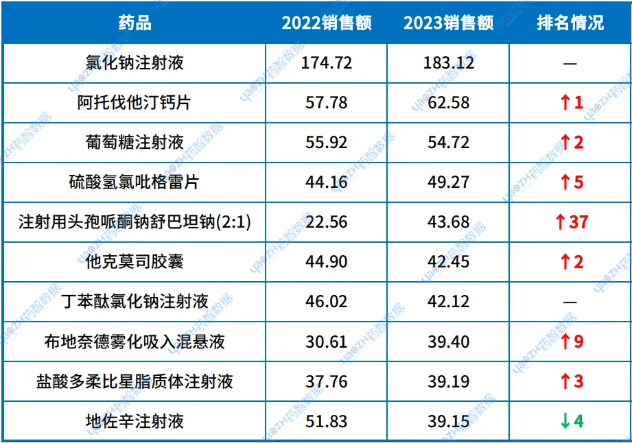 值得注意的是,氯化钠注射液、丁苯酞氯化钠注射液在激烈的竞争形势下,2023年保持排名不变。