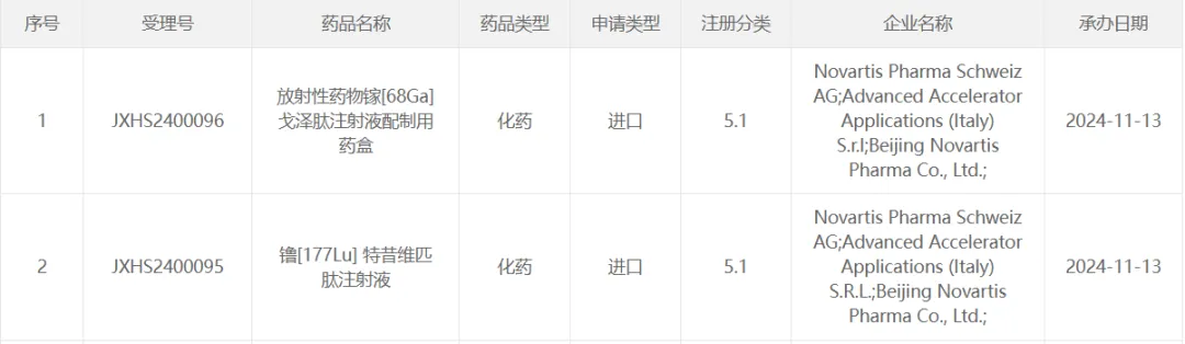 11 月 13 日,诺华的镥 [177Lu] 特昔维匹肽上市申请获 CDE 受理。此前该药已被 CDE 纳入优先审评,适用于治疗前列腺特异性膜抗原(PSMA)阳性转移性去势抵抗性前列腺癌(mCRPC) 、已接受雄激素受体通路抑制和紫杉类化疗的成年患者。
