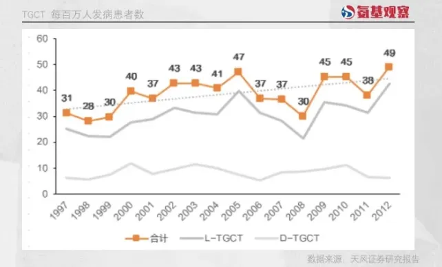 首先,全球TGCT患者存量规模并不小。虽然从发病率来看,TGCT属于一种罕见疾病,但作为非致命性的肿瘤,存在患者累积效应,因此存量患者规模较大。数据显示,目前国内存量患者大约是30万人,美国存量患者接近10万人。