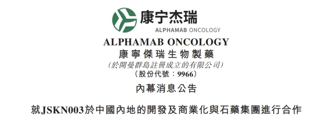 在国庆前一天,康宁杰瑞发布公告称,与石药集团子公司津曼特生物订立了一项许可协议。根据许可协议的条款,津曼特生物将获得在大中华区开发、销售、许诺销售及商业化JSKN003(一种靶向HER2双表位ADC)的独家许可及再权限,并成为该地区的唯一上市许可持有人。