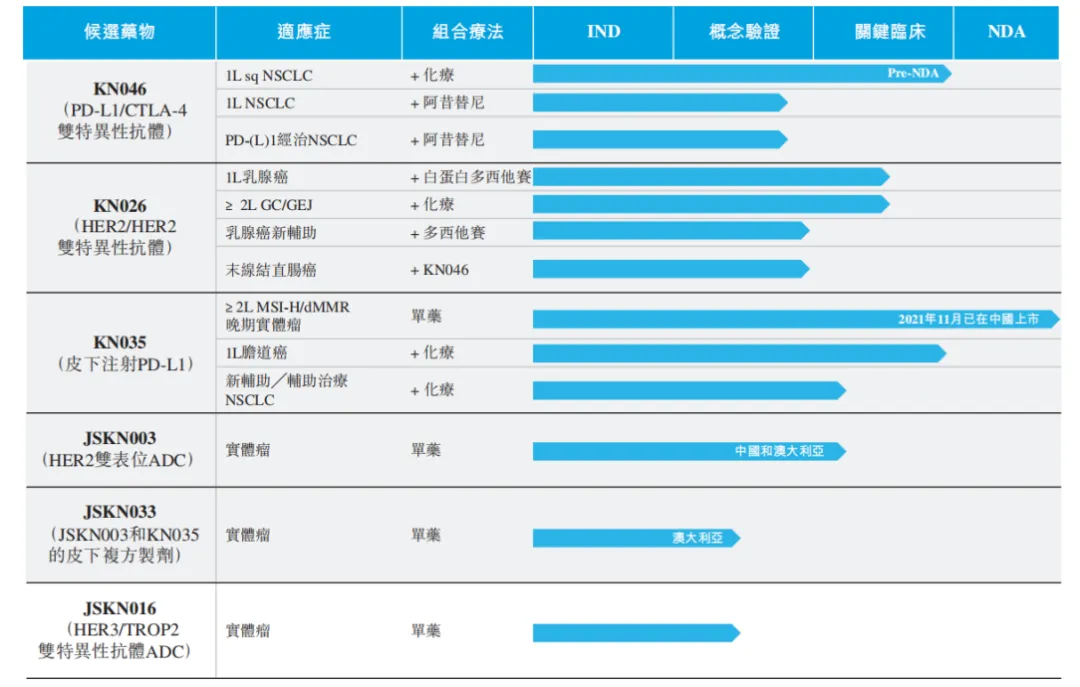 在以往的方案中,以复方制剂这种形式进行的药物联用较为少见,JSKN033具有探索性意义。更进一步细究之下,JSKN033是以KN026(HER2双抗)为基础的ADC,此等环环相扣的产品设计可以说在国内Biotech中绝无仅有。