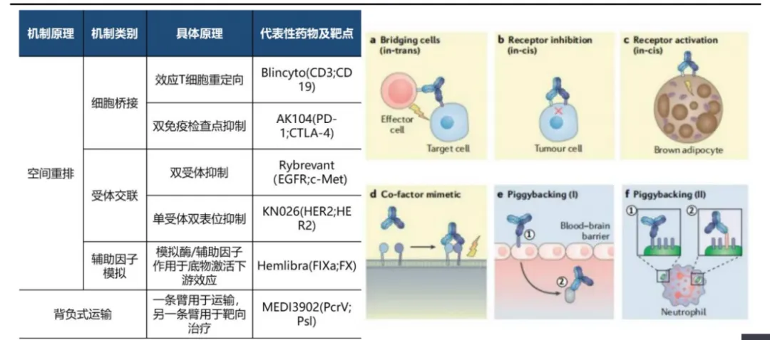 双抗靶向两种抗原或抗原表位,可以同时阻断或激活其介导的生物学功能,或使表达两种抗原的细胞相互接近,从而增强两者间的相互作用,并以不同的作用机制介导多种特定的生物学效应。目前普遍认为双抗的药效学或生物学作用机制主要包括空间重排和背负式运输,在研的大部分双抗药物采用空间重排(桥联细胞、桥联受体、桥联因子)的方式起效。
