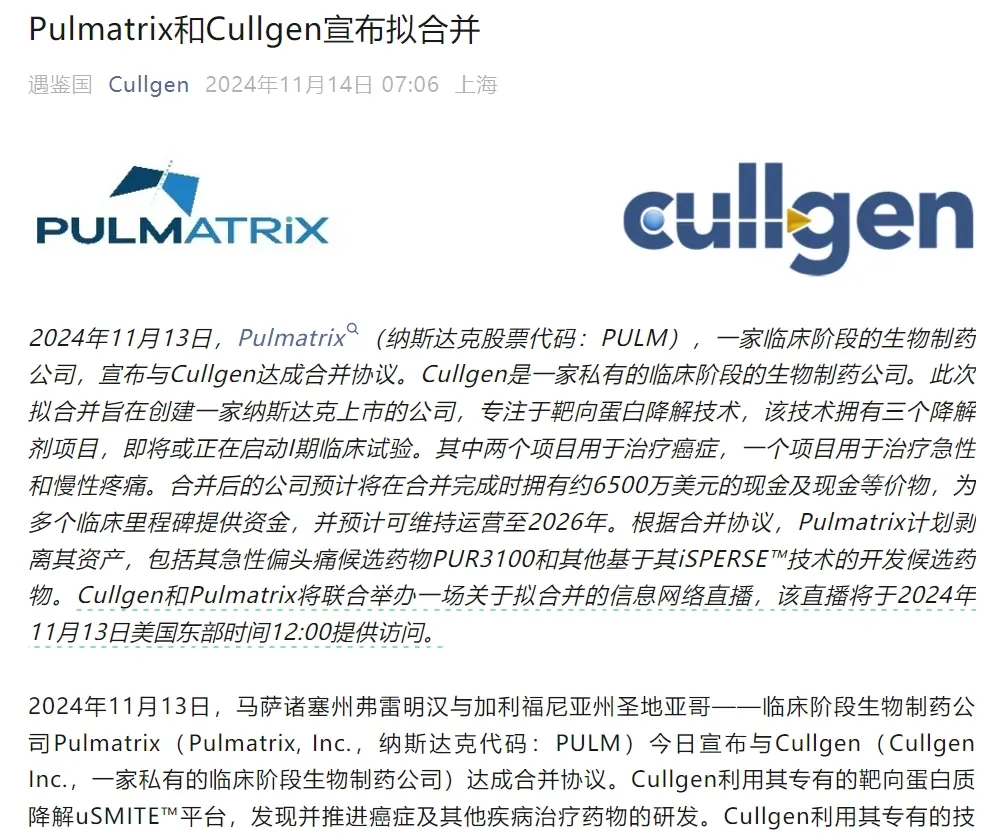 同在11月13日,睿跃生物(Cullgen)及普米斯生物技术公司两家中国Biotech先后宣布了各自的跨境并购动作,不同的是,前者是反向收购,后者是被收购。