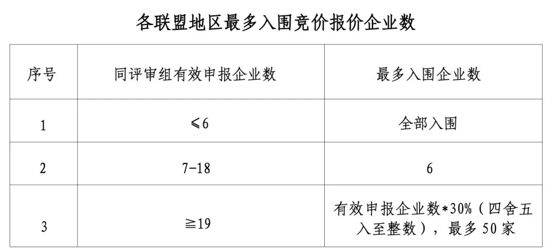 以评审组为单位,按照“综合评审指标”计算申报企业在各联盟地区的综合评审得分,由高到低确定顺位。排名前30%的企业确定为入围该联盟地区竞价报价环节企业,最多可以入围50家。