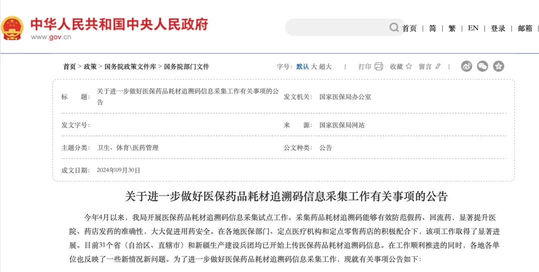 国家医保局强势推动追溯码信息采集工作 图源:中国政府网