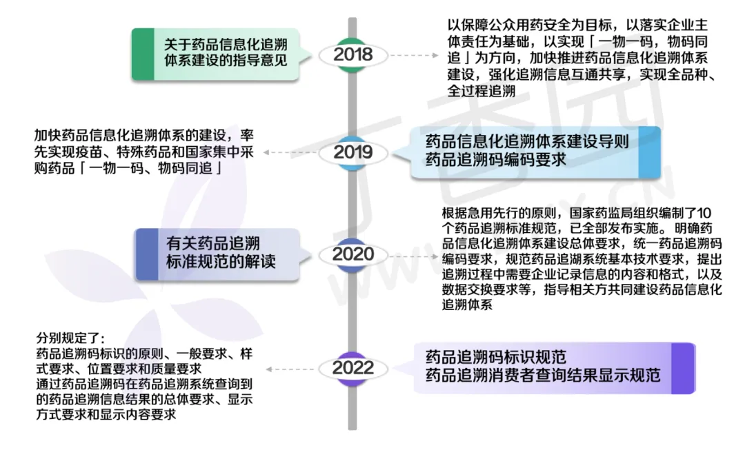 2018 年,国家药监局正式发布《关于药品信息化追溯体系建设的指导意见》,提出要建设「一物一码,物码同追」的药品追溯体系,强化药品追溯信息互通共享,实现药品生产、流通和使用全过程来源可查、去向可追、责任可究。
