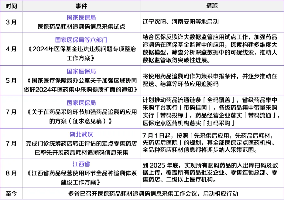 随着企业赋码推进逐步深入,2024 年,全国深入整治骗取医保基金工作部署会决定加快推进药品追溯码「应扫尽扫」后,国家医保局于 7 月发布《关于在药品采购环节加强药品追溯码应用的方案(征求意见稿)》,各地的实际推进也全面提速。