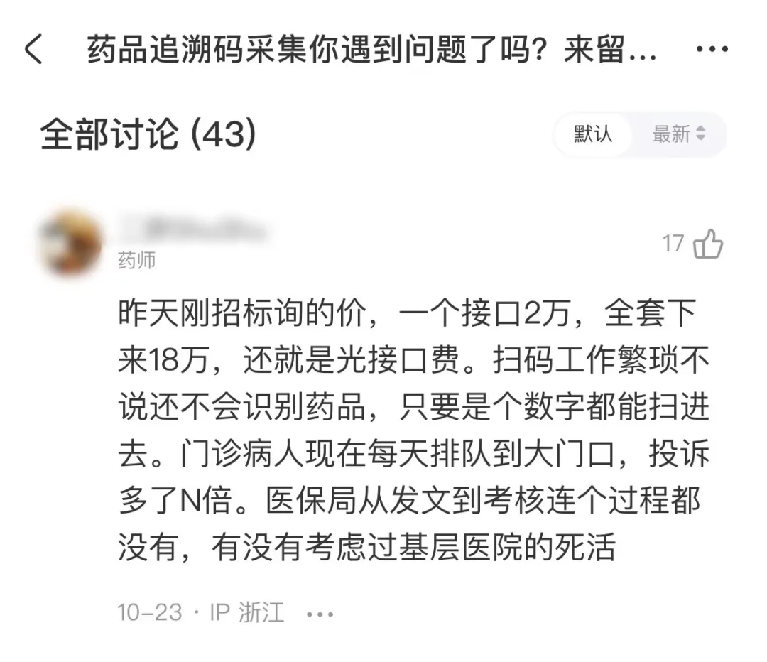 但相同的改动花销,基层医疗机构感知的负担其实更为明显。有一线药师在丁香园社区发言,招标询价种一个接口是 2 万,仅接口费全套就要 18 万,而改造后的系统也并不好用:
