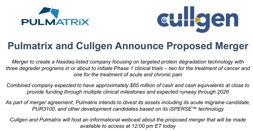 Cullgen董事长兼首席执行官罗楹博士表示:“我很高兴宣布与Pulmatrix的合并计划,这是我们公司发展的关键时刻,因为我们将靶向蛋白质降解剂的管线推进到癌症和其他疾病的临床开发中。在纳斯达克上市将有助于推动我们的增长,使我们能够释放我们技术平台的全部潜力,包括我们开发和推进降解剂-抗体偶联物和其他靶向蛋白质去降解剂进入临床的计划。”Pulmatrix临时首席执行官Peter Ludlum表示:“在对战略选择进行彻底评估后,Pulmatrix董事会和管理团队认为,此次预期交易为我们的股东提供了一个创造价值的机会。我们预计,此次合并将使我们的股东能够参与Cullgen有前景的研发活动,并在合并结束前以潜在股息的形式提供利益。在交易结束之前,我们将通过剥离包括PUR1800、PUR3100和iSPERSE™专利组合在内的公司资产来增加可用于特别股息的现金。”